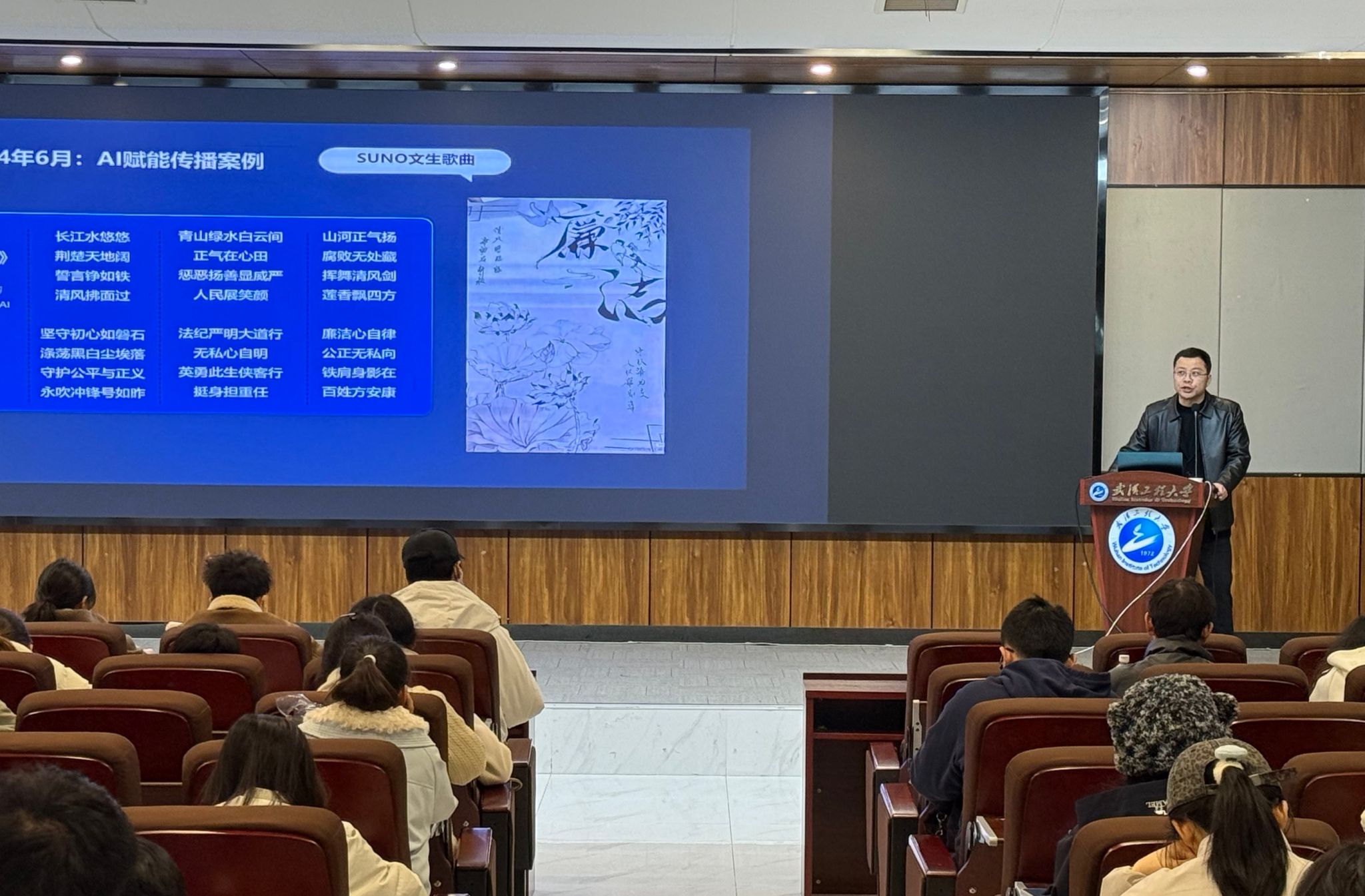 本网讯(通讯员 方源)3月7日下午,武汉工程大学2025-2026年度校级“青马工程”培训班第十次集中授课在流芳校区计算机学院图灵报告厅顺利举行。湖北广播电视台邓国辉、秋叶集团哈雷两位专家应邀为全体学员授课,围绕宣传素养提升与人工智能工具应用展开专题培训。邓国辉老师以《AI时代新闻宣传和新媒体产品制作》为题开讲。他现场播放了由AI工具Suno生成的歌曲《清风侠》,直观展示了人工智能在内容创作中的革新力量。结合文生图、文生视频等前沿应用,...