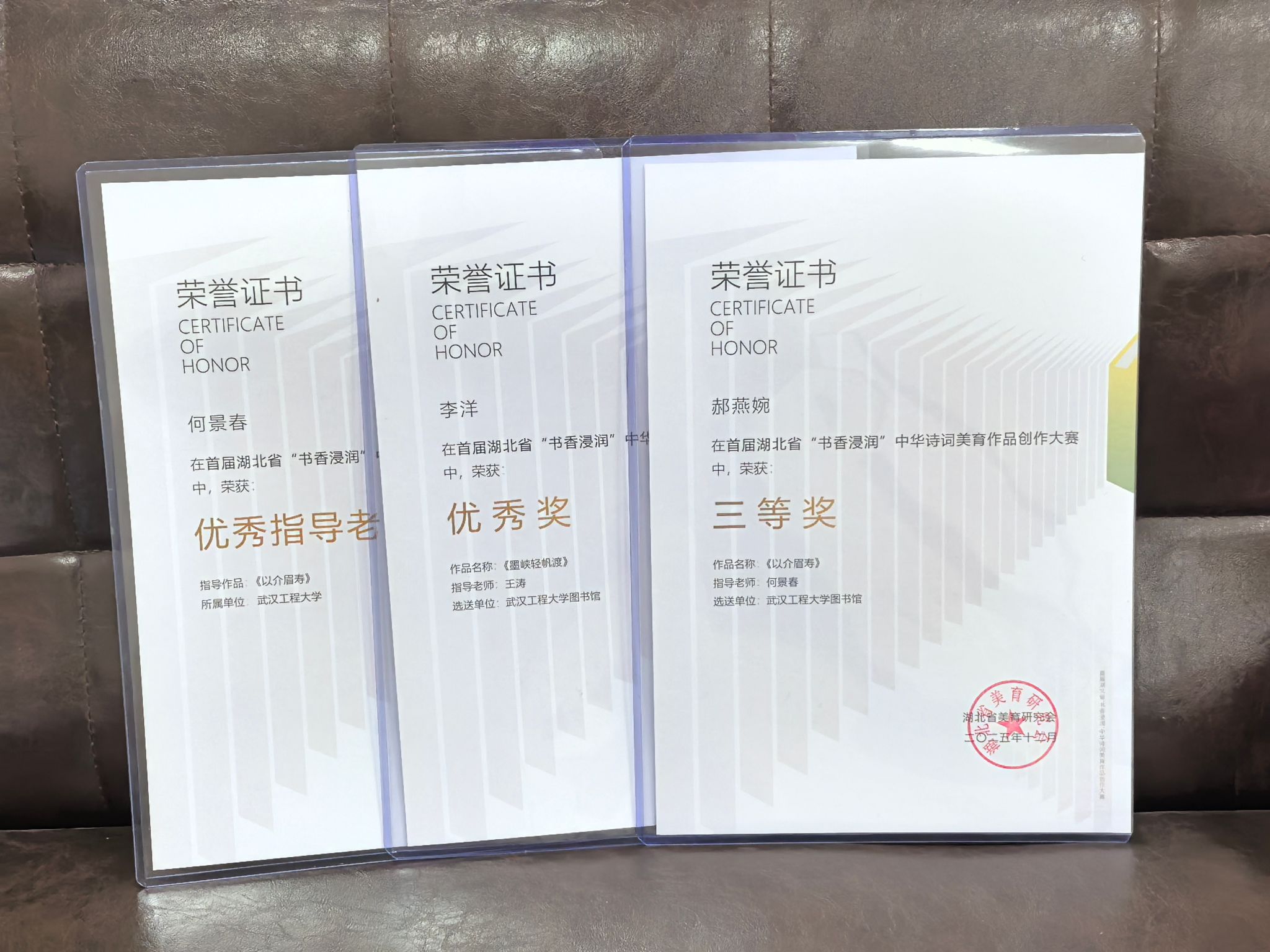 本网讯(通讯员 苗苑)近日,首届湖北省“书香浸润”中华诗词美育作品创作大赛评审结果正式揭晓。我校获“优秀组织单位”,马克思主义学院郝燕婉同学的作品《以介眉寿》荣获三等奖,李洋同学的作品《墨峡轻帆渡》荣获优秀奖。此外,马院何景春老师获评“优秀指导老师”,图书馆赵春阳、熊洁、苗苑三位老师获评“优秀组织个人”。大赛自2025年5月30日启动,由湖北省美育研究会主办,依托“阅途美育在线”数字平台,面向全省高校师生征集围绕中华古诗词创作的静态与动态艺术作品。...