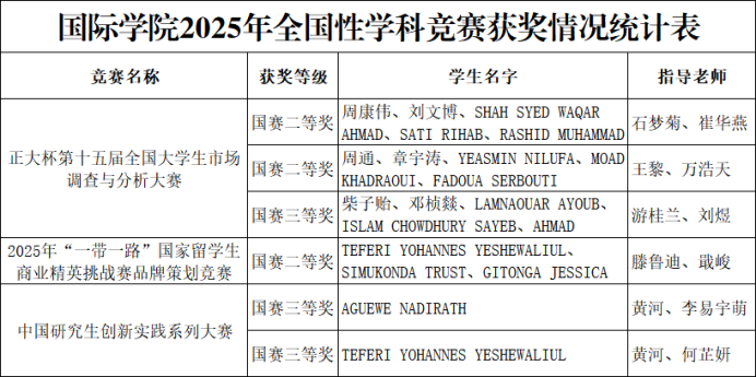 本网讯(通讯员 黄河)近日,2025年全国性学科竞赛获奖名单陆续公布,国际学院留学生在各类赛事中表现突出,凭借扎实的专业基础、出色的实践能力和良好的跨文化协作水平,斩获国家级奖项共6项,其中二等奖、三等奖各3项,获奖数量与质量较往年有明显提升,充分展现了我校来华留学生教育的育人成效与国际化人才培养质量提高。参赛范围覆盖中文应用、文化交流、专业技能三大领域,留学生团队在各赛道均展现出良好水平。其中,在中国研究生创新实践系列大赛中,...